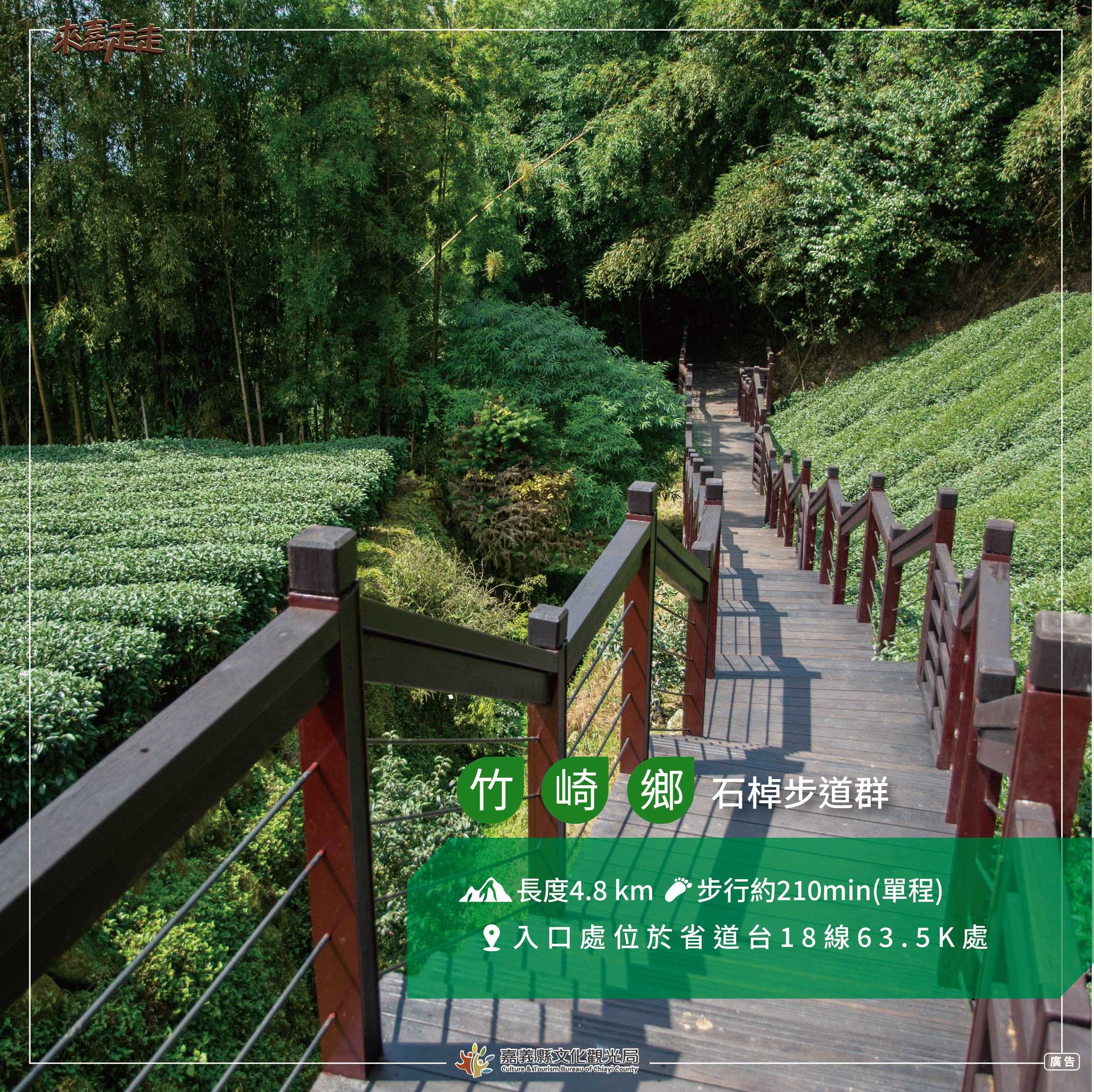 竹崎鄉的4條親子步道路線平緩、景色宜人,適合親子共遊。其中位於金獅村的「出水坑步道」,因山泉與野溪匯流而得名,全長約1.4公里,沿途林木茂密、茶園環繞,山巒雲霧相伴。有五星級步道美譽的「石棹步道群」,由霧之道、茶之道、霞之道、雲之道、櫻之道及愛之道串連而成,每條步道各具特色,可欣賞到霧色、雲景、霞光、茶園、杉林及竹林等不同景致,十分適合親子同遊!