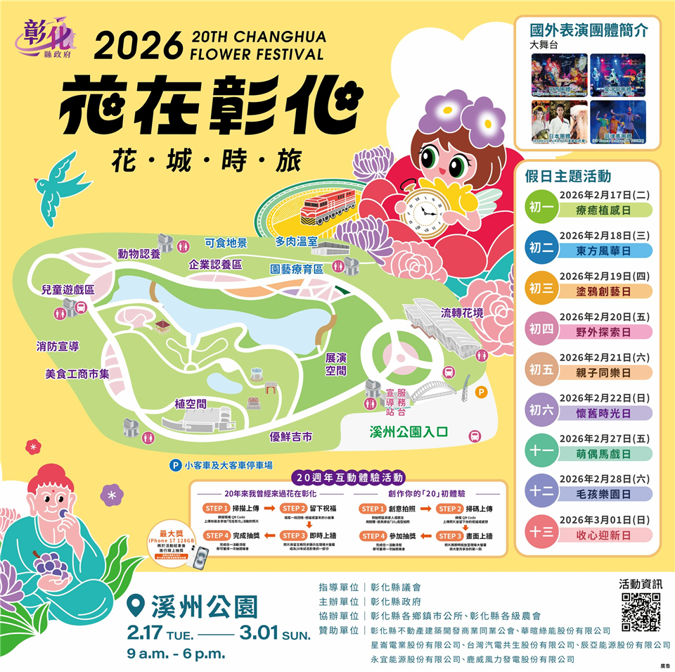 全台春節走春第一品牌「花在彰化」迎來20週年里程碑!彰化縣政府3日舉辦記者會,縣長王惠美宣布 2026「花在彰化」以「花城時旅」為主題,從大年初一(2月17日)至正月十三(3月1日)在溪州公園盛大登場。王縣長表示今年有三大亮點:一是繽紛的花卉饗宴,以「花城時旅」為活動主題,融合生活花藝與沉浸式體驗;二是精彩的9大假日主題活動,從親子同樂到毛孩樂園、國際團隊演出及特色市集,推出「滿額送」及「兩倍券」促銷;三是「20週年主題互動體驗」,上傳精彩回憶,即時呈現電視牆、列印紀念照,還可抽 iPhone 17 與農特產好禮!