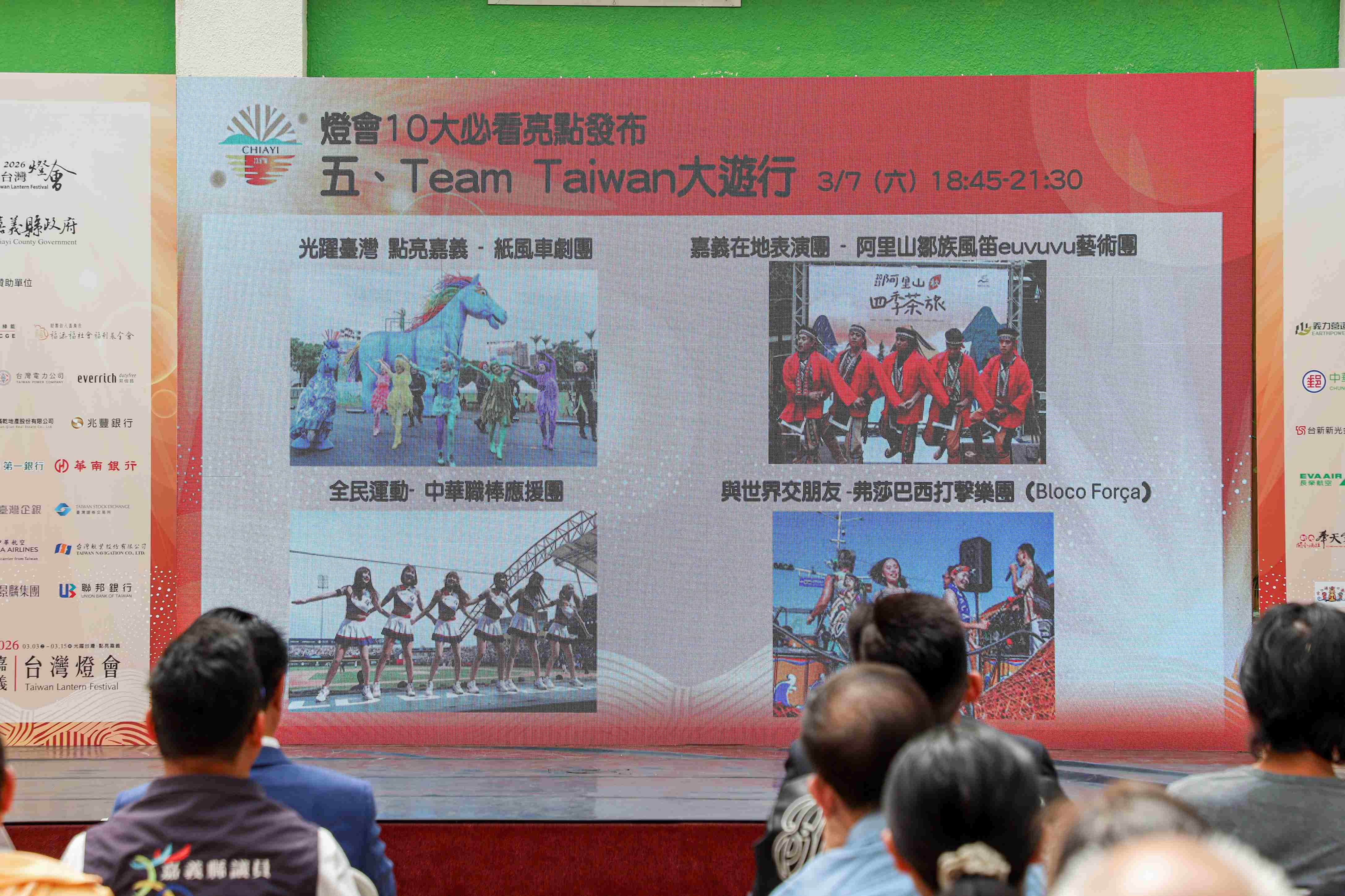 2026台灣燈會正式進入倒數7天,嘉義縣政府今(24)日舉辦「光躍台灣・點亮嘉義—天天都精彩燈會亮點宣傳記者會」,完整公開燈會精彩內容,包含16大在地燈區、12大必看亮點以及交通接駁資訊,正式向全國民眾宣告,嘉義已準備就緒,迎接來自各地的賞燈人潮。