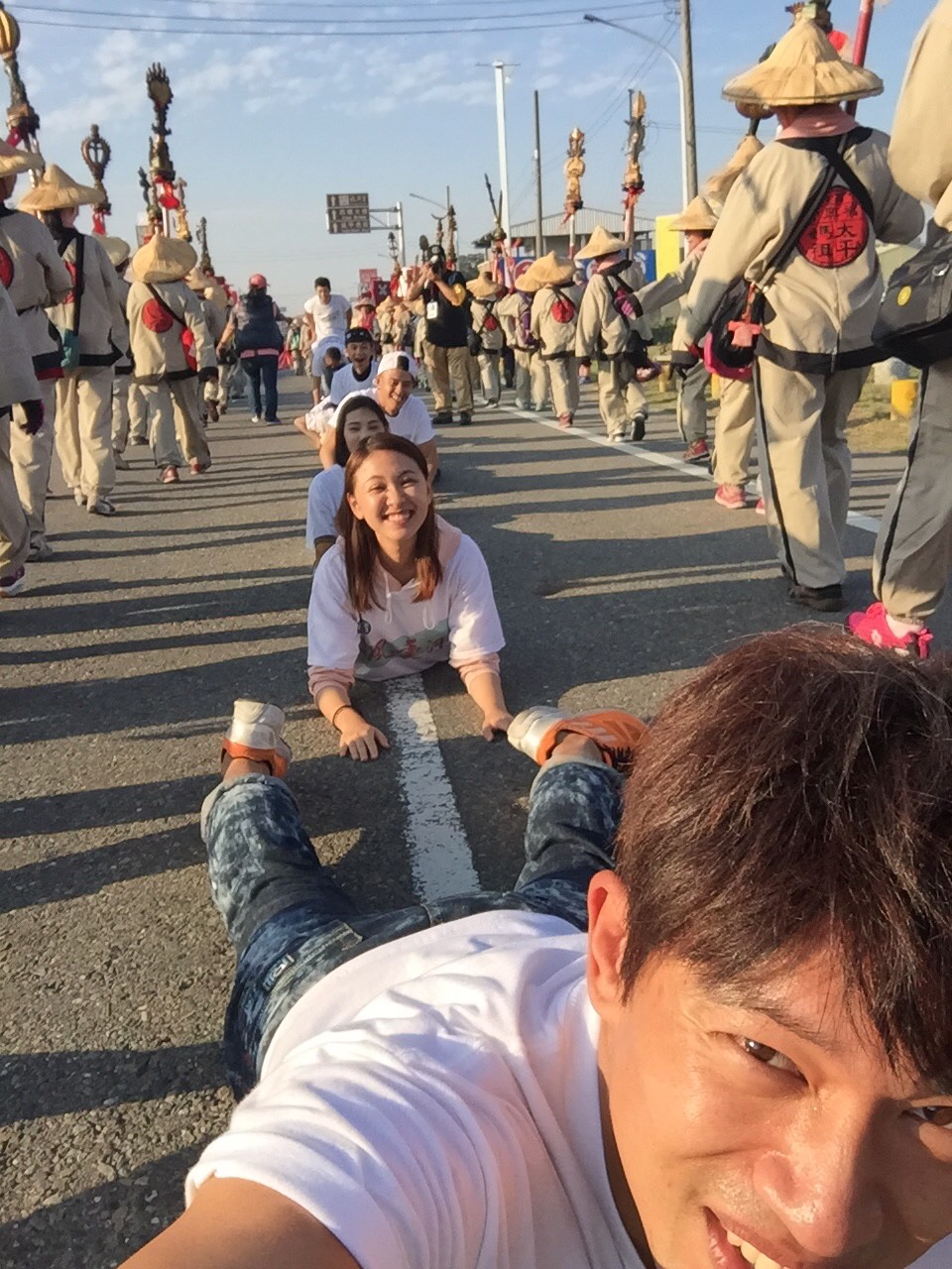 繼台北饒河夜市掃街見面活動,李政穎、林玟誼、黃玉榮、吳政迪與林宜禾等人接續前往台中逢甲夜市掃街造勢,前往夜市前,演員們還特別參加雲林「西螺福興宮媽祖遶境活動」,演員們虔誠地趴在地上讓媽祖鑾轎從他們身上越過體驗「稜轎腳」,期望這一年能得到媽祖的庇佑。難得有機會一群人趴在地上,林玟誼笑說:「真是第一次把政穎哥的腳底看這麼清楚!」李政穎跟黃玉榮也齊力扛媽祖鑾轎走了一段路,邊扛鑾轎黃玉榮邊說:「第一次就獻給了媽祖! 感到非常榮幸、非常開心!」李政穎則笑著說:「民眾跟南部天氣一樣熱情,已經流汗了!」表示很久沒有流這麼多汗了,經過這次初體驗,他們感覺媽祖一定會更保佑,祈求《春風愛河邊》全體演員、劇組工作人員拍攝順利平安,以及收視長紅!