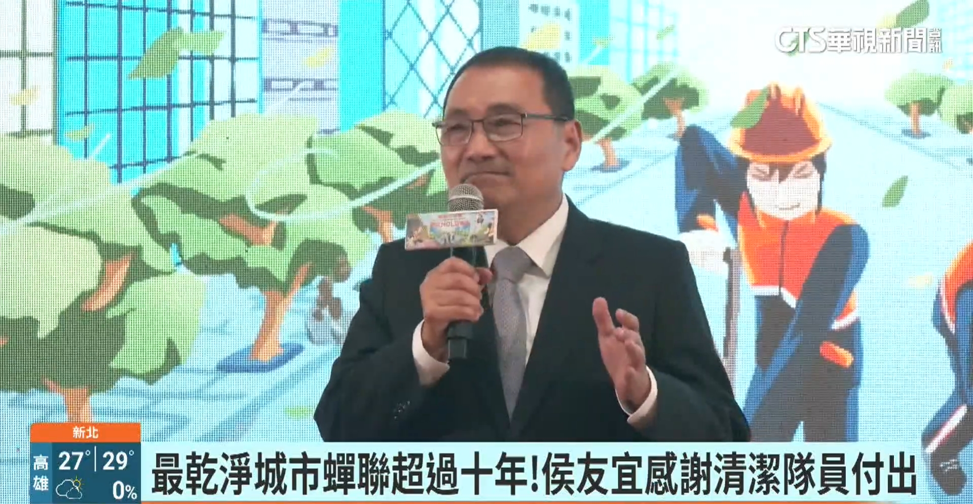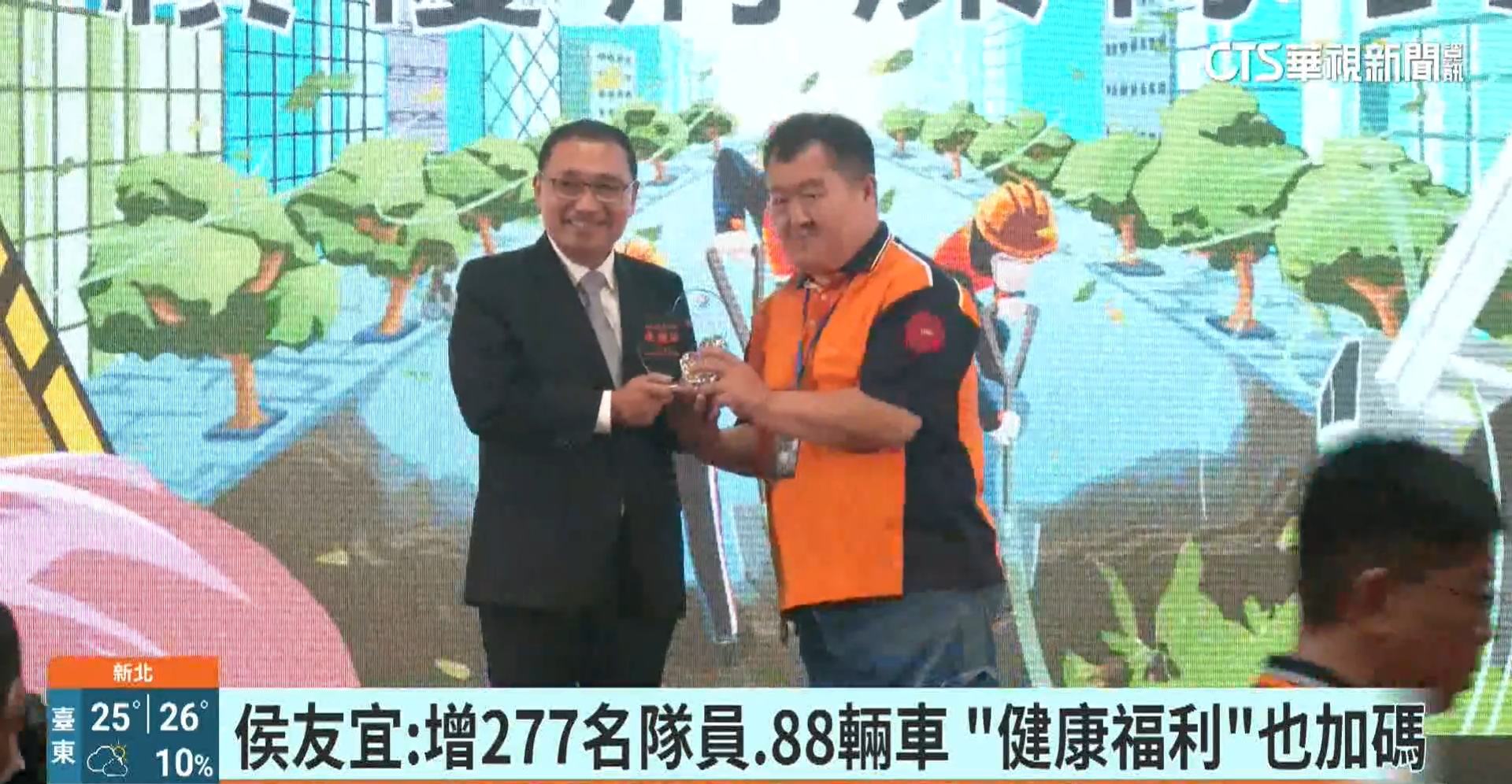 侯友宜表示,清潔隊員就像一群環保特務,無論是垃圾收運、防疫消毒或災後重建,隊員們都在第一時間率先出動,是新北市最堅強的後盾,為提升清潔隊的工作效能與安全保障,妥善照顧每位清潔隊員,自明(115)年起將分4年增加清潔隊員人力及增購清潔車輛,以全面提升清運服務效能,並減輕隊員工作負荷。此外,也提升隊員健康檢查補助費用,並首創全臺增列隊員肺部低劑量電腦斷層檢查項目,專為45歲以上男性及40歲以上女性隊員設計,保障清潔隊員的健康安全,讓這群環保特務持續守護新北市。